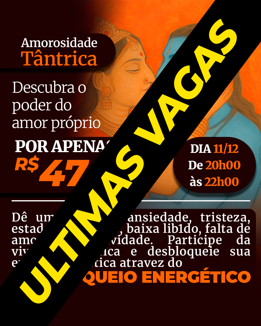 O investimento é de R$47,00 e inclui toda a condução da vivência, orientações teóricas e práticas guiadas, além do material de apoio necessário para a experiência. É um valor acessível para que mais pessoas possam conhecer o Tantra de forma séria e responsável.